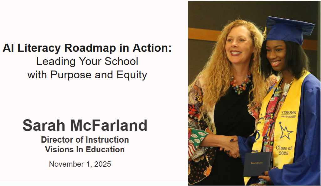Discover how Sarah McFarland & Visions In Education is preparing teachers and students for an AI-powered world. Explore my Khan Academy presentation and handouts to see our AI Literacy Framework in action—featuring our Task Force model, educator Power Hours, student Transparency Badges, and one of California’s first AI CTE pathways.